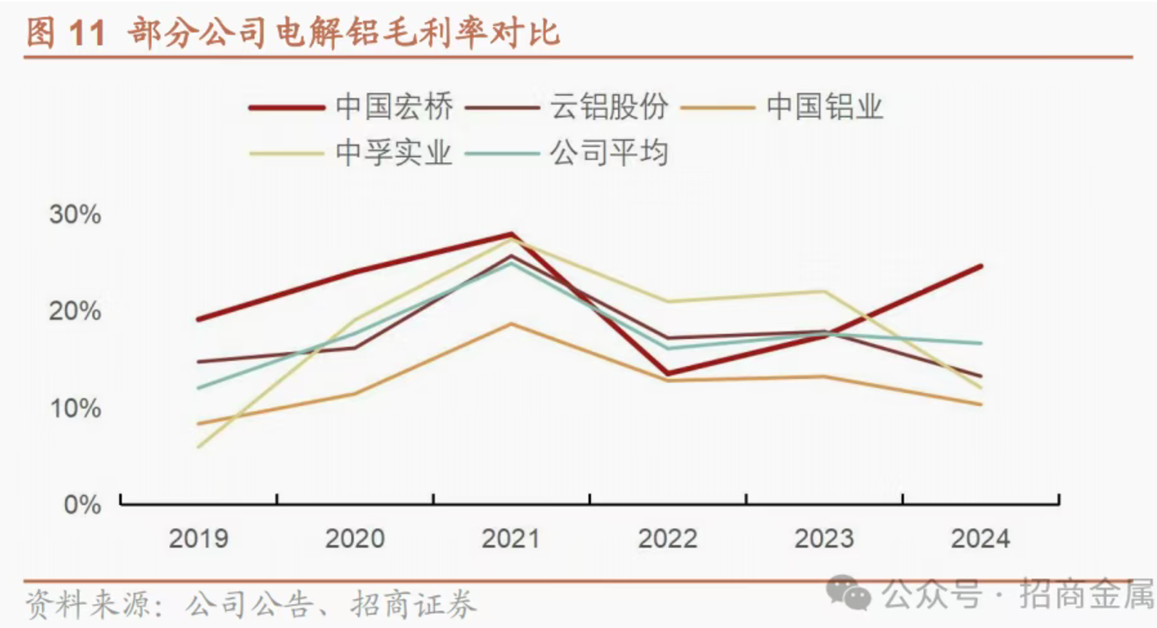 不过只看电解铝的话,中国铝业的毛利率常年低于同行业。