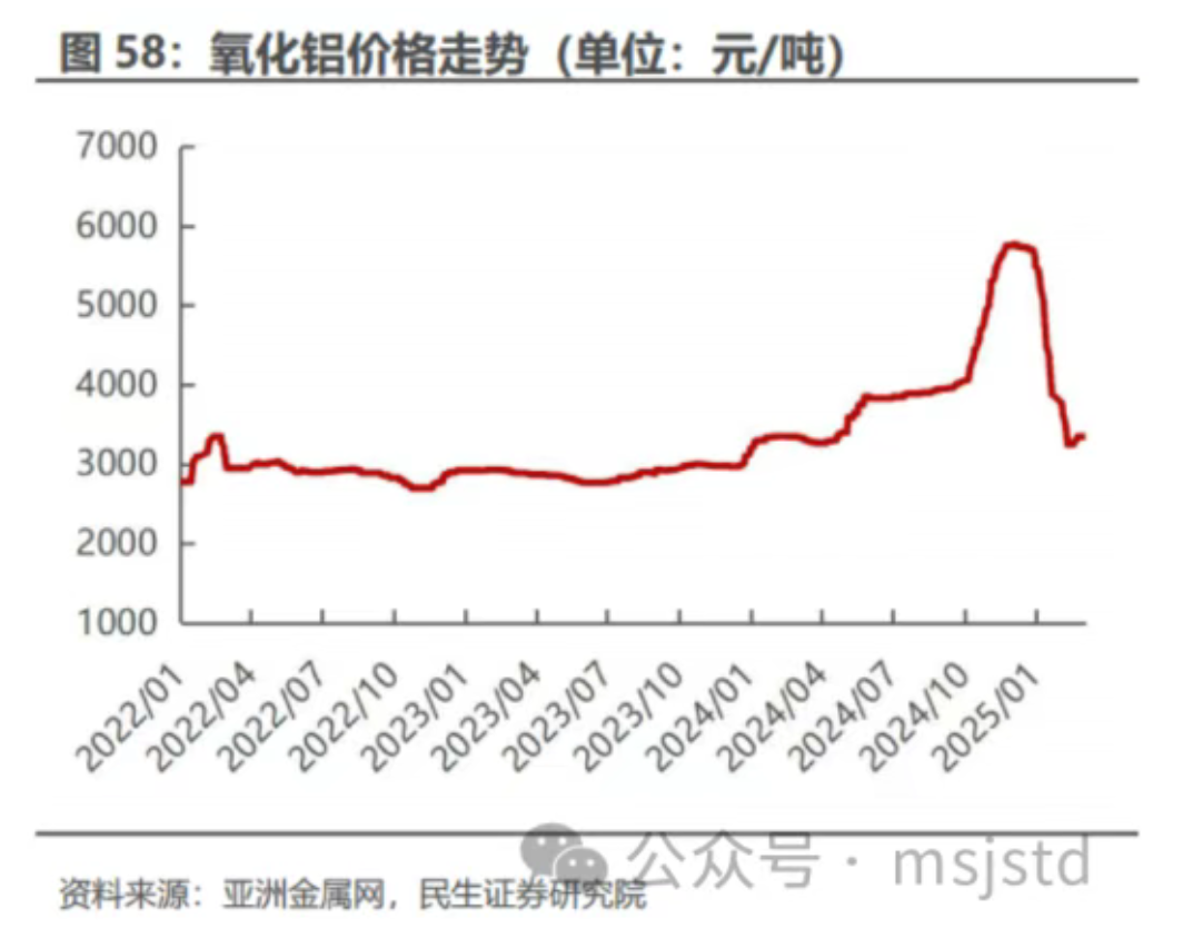 目前氧化铝产能供给充分(近期还有大量产能投产),氧化铝价格可能主要受上游铝土矿资源影响。国内铝土矿年产量在2018年后逐年下降,2018年产量10316万吨,2024年5808万吨。国内铝土矿主要产区包括山西、河南、贵州和广西,四省铝土矿产量约占全国94%。其中山西和河南的矿山因安全和环保问题大面积停产,复产进展缓慢,且供给端新增矿山开采项目不多,批复时间及流程长,实际投产困难较大。