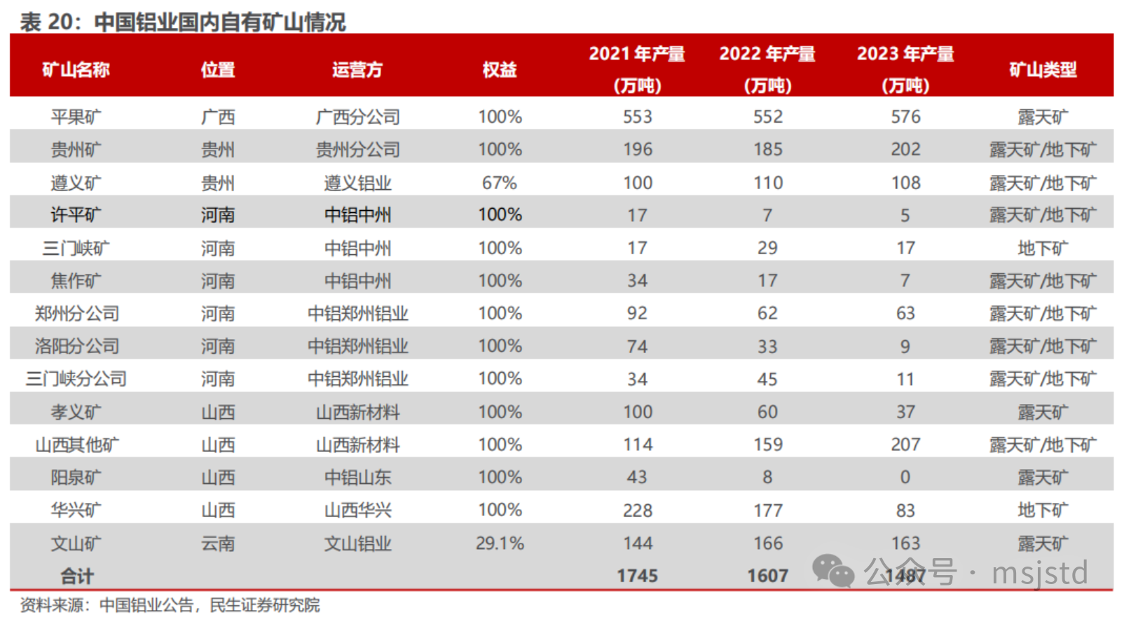 中国铝业的国内铝土矿资源第一,截至2023年,国内铝土矿储量1.6亿吨,资源量5.4亿吨,占国内储量29%。不过中铝的国内铝土矿产量在下滑,2021/22/23年,国内铝土矿产量分别为1745/1607/1487万吨。主要是山西、河南两地铝土矿产能下降较大。贵州、云南、广西等地铝土矿产能略有增长。