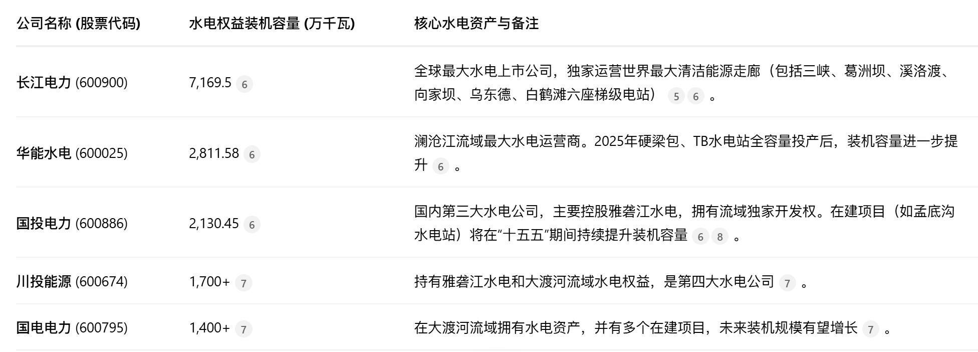 前五大水电公司,长江电力、华能水电、国投电力、川投能源、国电电力,对应流域是长江、澜沧江、雅砻江、大渡河。下表的具体装机数没核实。