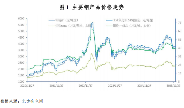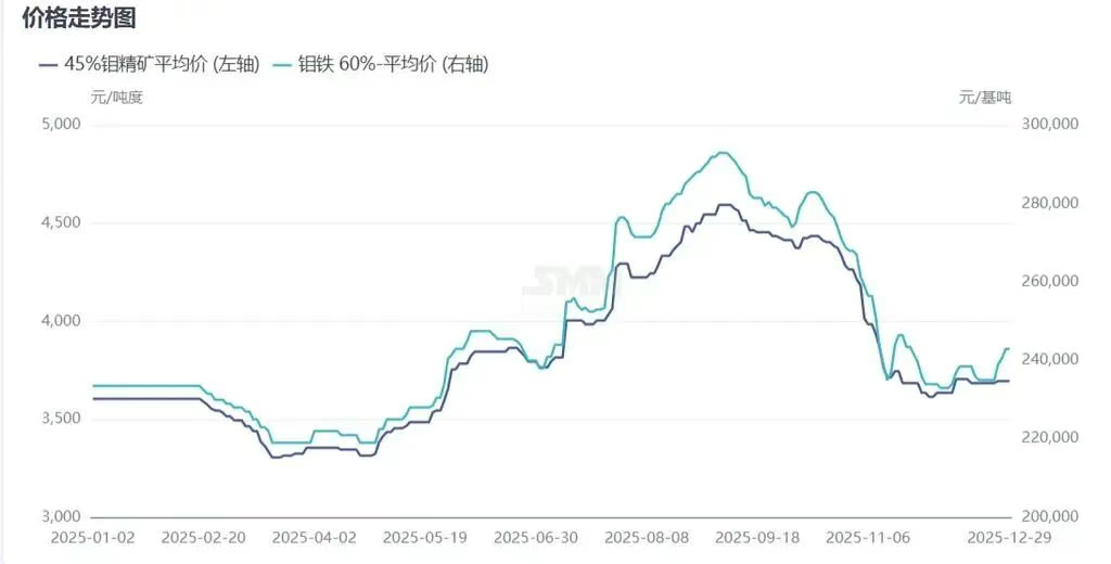 2025年45%钼精矿年均价3836元/吨度(17.3万),同比上涨6.7%。12/29钼精矿价格3695元/吨度(16.6万元)。4月份是低点,9月份是高点。下游钢铁行业有金三银四、金九银十的说法,冬春季节一般是淡季。