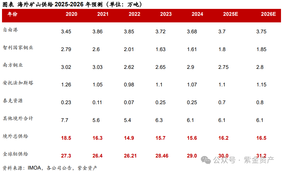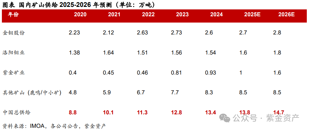 未来的矿山增量预期:2026年巨龙二期投产,钼精矿增量约0.6万吨;海外矿可能受到品位下降影响,增量有限。紫金资产测算的2026年全球钼矿增量都不大,2027H2年以后沙坪沟2.7万吨增量,金钼也能受益。