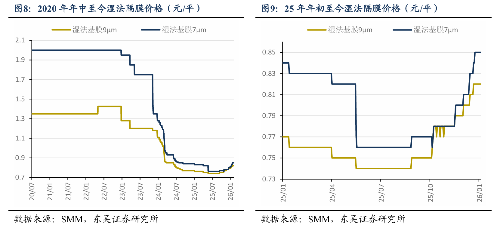 隔膜规格可以按厚度来区分,高端动力电池/消费电子电池用7-9μm,9μm的用量可能比较多,动力电池和储能电池都能用。普通的储能电池会用12-16μm,还有的地方会用20-25μm的。
