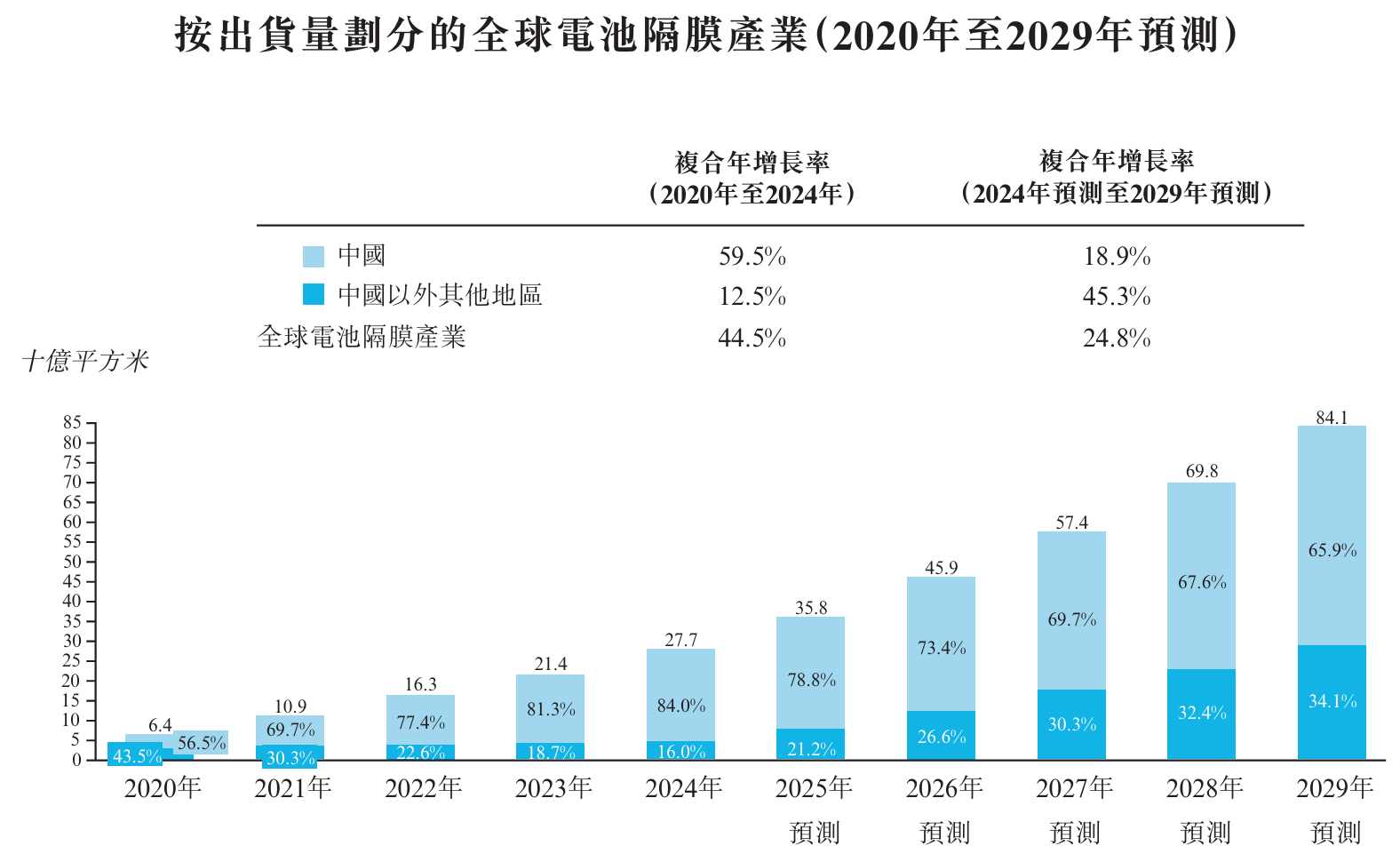 这是星源材质港股招股说明书里对隔膜出货量的预期,2025年出货量358亿平米,2029年预期841亿。隔膜出货量是跟着电池出货量走的,未来谁都不敢打包票,要靠信仰。