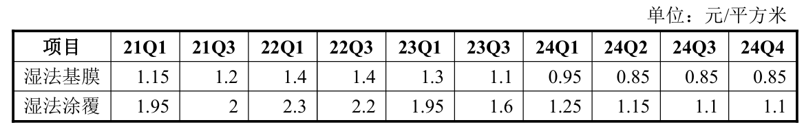 2023年之前,隔膜的价格都还比较稳,之后产能释放了,价格就崩了。湿法基膜和涂覆之间的价差是涂覆环节的加工费,2021年还有0.8元,现在也被砍到0.25元了。