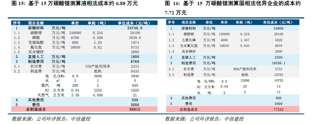 单位产能投资成本方面,固态法大概3.3-3.5万元/吨,液态法大概1.9-2.2万元/吨。有券商测算,15万碳酸锂价格下,液态法6F成本6.88元,固态法6F成本7.72元,大概差8000元/吨。