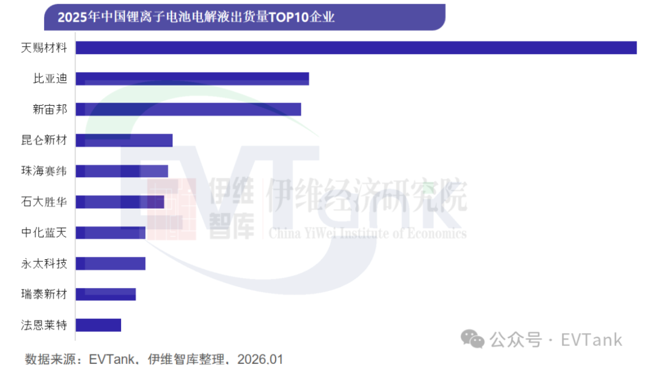 电解液行业的竞争格局算是一超多强吧。比亚迪自供电解液,第三方电解液厂商龙一是天赐材料、龙二是新宙邦。2025年,天赐材料出货量72万吨,大幅领先同行。