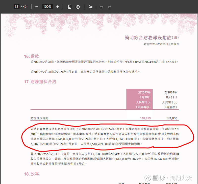向受影響實體提供的財務擔保合約已於2025年2月28日及2024年8月31日在簡明綜合財務報表確認。於2025年2月28日,倘擔保遭要求悉數償還,則本集團就授予受影響實體的銀行融資向銀行發出財務擔保而可能須支付的未償還總金額為人民幣3,741,032,000元(於2024年8月31日:人民幣3,934,939,000元),未償還財務擔保中的人民幣2,316,802,000元(於2024年8月31日:人民幣2,510,709,000元)已被受影響實體動用。” (见截图)