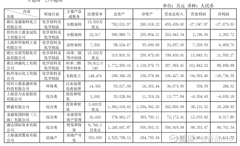 房地产开发: 上海晟诺置业有限公司亏损 -2,368.51 万元(不过另一家子公司龙盛置地集团微利 656.18 万元,整体地产板块表现低迷)。