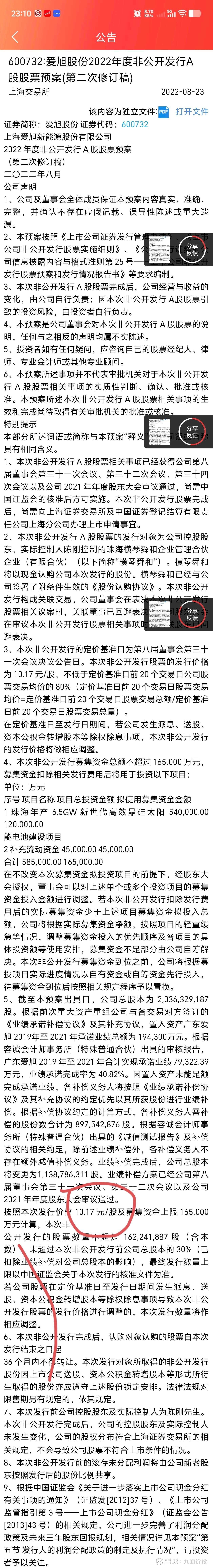 - **背景(定增预案):** 2022年5月,爱旭股份发布定增预案,实控人陈刚拟以**10.17元/股**的低价(当时市价的不到三折)全额认购,募资约16亿元。