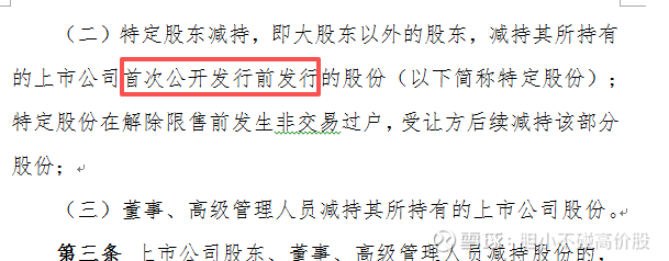 在所有适用条款里,通篇没有提到花王财投获得的资本公积金转增股份类型,而是强调的是上市公司首次公开发行前发行的股份,俗称是IPO前的股份,我们一般就理解为,上市公司在二级市场正式发行股票交易前,其内部股权架构里已经给名下各股东划分的原始股。