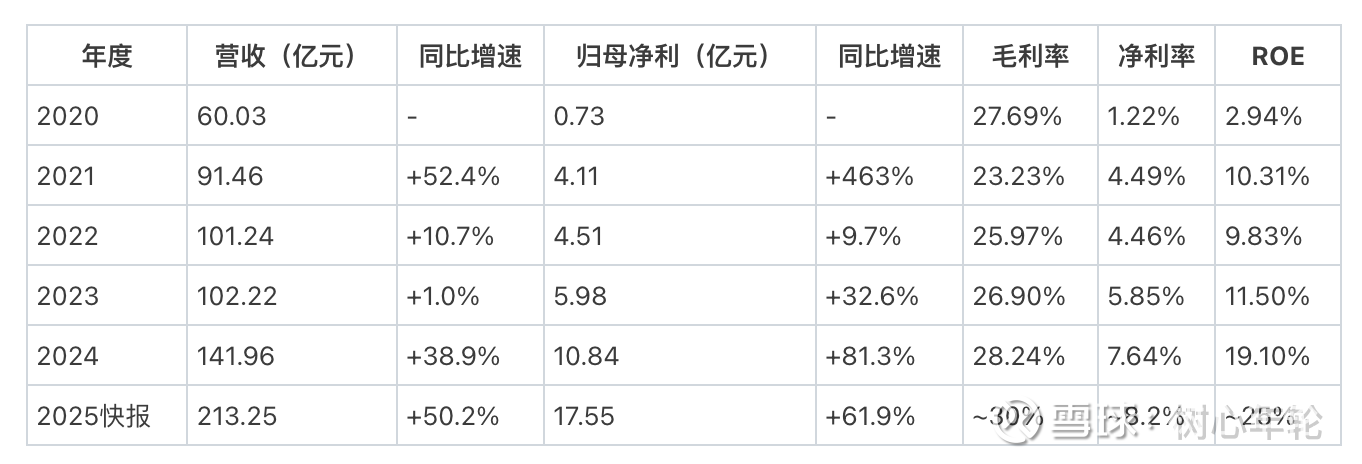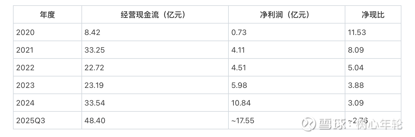 拉长看2020-2025年:5年间营收CAGR约29%,归母净利CAGR约89%(利润增速是营收增速的3倍),经营现金流从8.42亿增长至约48亿(2025Q3前三季度),三者同向强劲增长。增长质量确认为"健康且正在加速"。