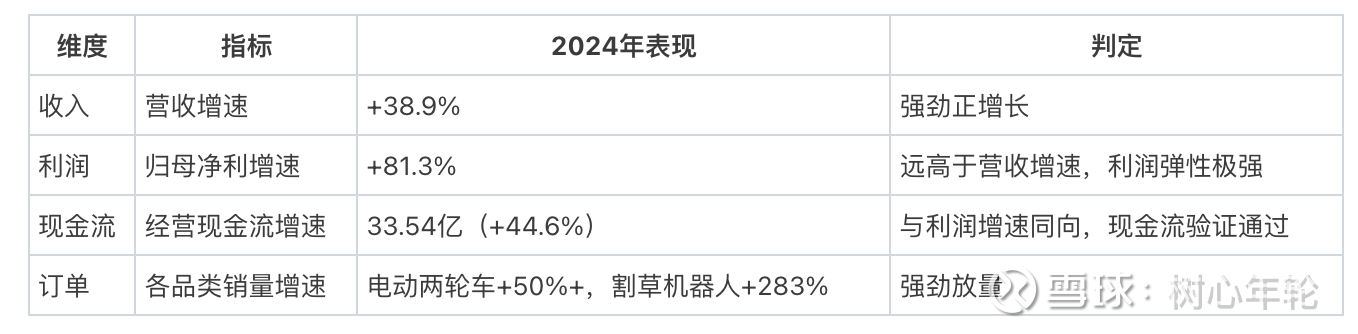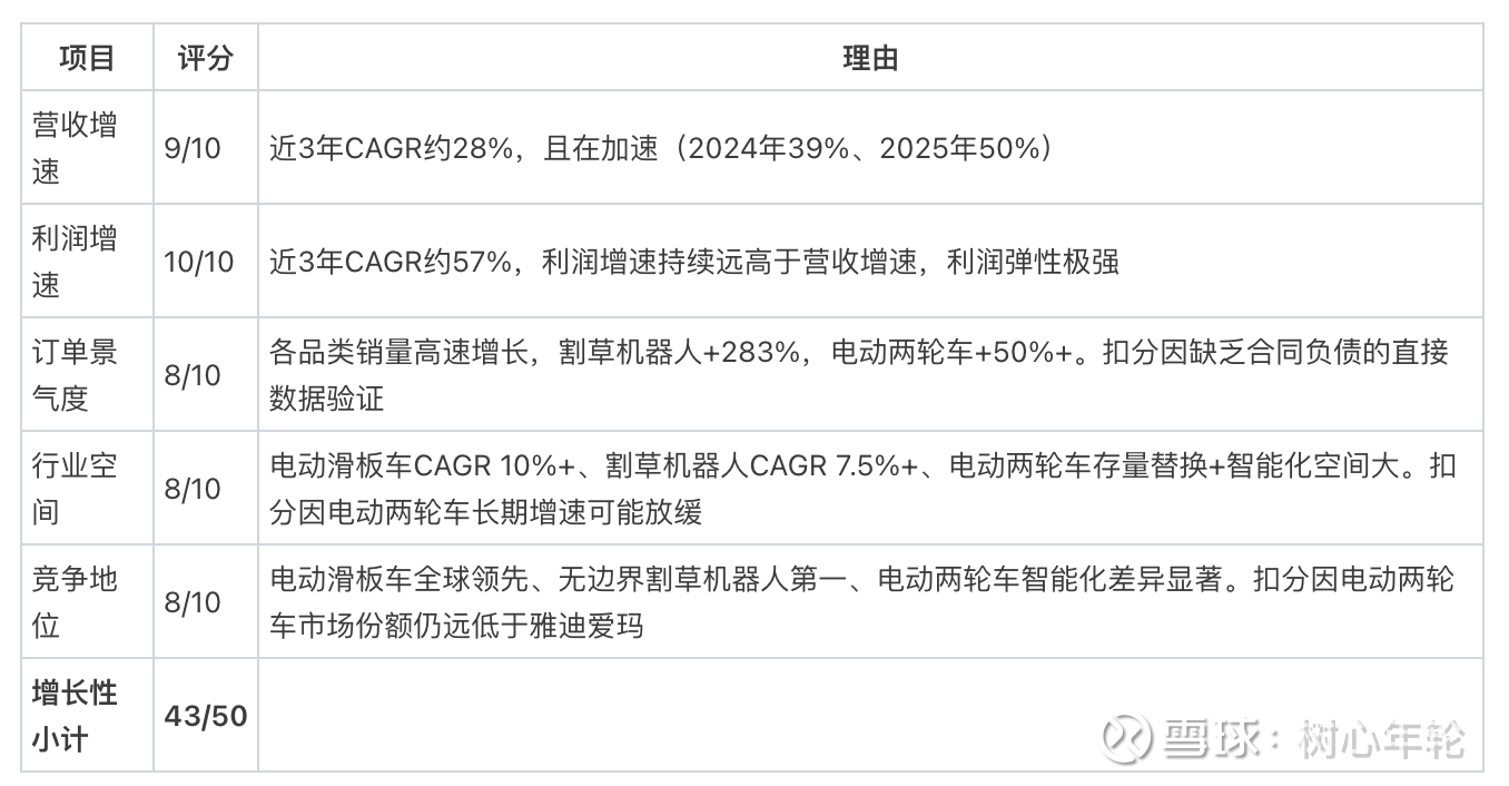 项目评分理由营收增速9/10近3年CAGR约28%,且在加速(2024年39%、2025年50%)利润增速10/10近3年CAGR约57%,利润增速持续远高于营收增速,利润弹性极强订单景气度8/10各品类销量高速增长,割草机器人+283%,电动两轮车+50%+。扣分因缺乏合同负债的直接数据验证行业空间8/10电动滑板车CAGR 10%+、割草机器人CAGR 7.5%+、电动两轮车存量替换+智能化空间大。扣分因电动两轮车长期增速可能放缓竞争地位8/10电动滑板车全球领先、无边界割草机器人第一、电动两轮车智能化差异显著。扣分因电动两轮车市场份额仍远低于雅迪爱玛增长性小计43/50