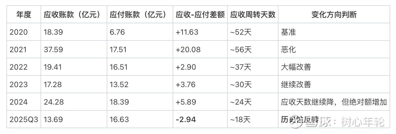 2024-2025Q3:应收周转天数进一步降至18天。但最重要的质变发生在2025Q3——应收账款13.69亿元,首次低于应付账款16.63亿元,差额为-2.94亿元。这意味着公司从"被产业链占款"变成了"占用产业链资金"。公司拖着供应商的钱(16.63亿),比客户拖公司的钱(13.69亿)多出近3亿元。