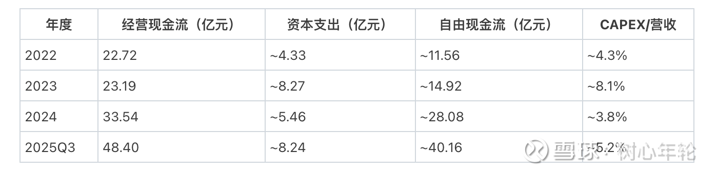 推演分析:自由现金流从2022年的11.56亿增长至2025Q3(前三季度)的40.16亿,增长了约2.5倍。这说明公司不仅经营造血能力在增强,而且资本支出保持了相对克制——CAPEX/营收比例在3.8%-8.1%之间波动,均值约5%,属于轻资产模式。