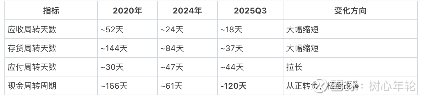 现金周转周期从2020年的约166天暴降至2025Q3的约-120天。负值意味着什么?意味着公司从收到原材料到把产品卖出去收到钱,这个过程中不需要自己垫任何资金——反而是上下游在替公司垫资金。公司在卖出产品收到钱之前,就已经从供应商那里获得了足够长的账期,用别人的钱做自己的生意。