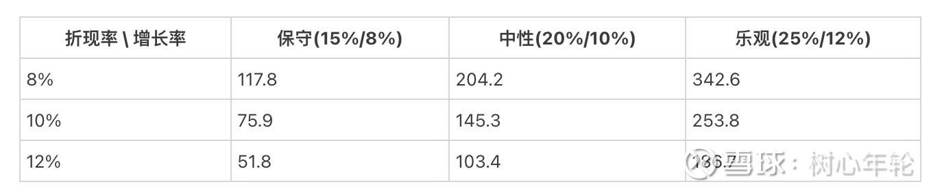 折现率 \ 增长率保守(15%/8%)中性(20%/10%)乐观(25%/12%)8%117.8204.2342.610%75.9145.3253.812%51.8103.4186.7