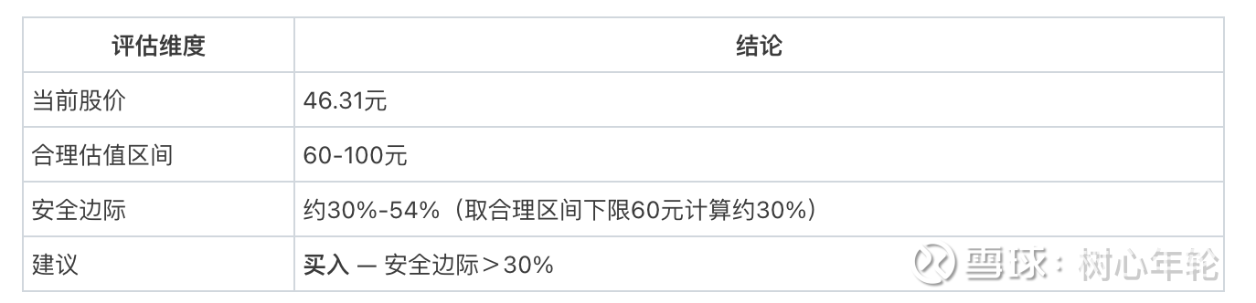 评估维度结论当前股价46.31元合理估值区间60-100元安全边际约30%-54%(取合理区间下限60元计算约30%)建议买入 — 安全边际>30%