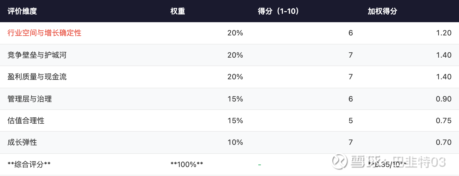 评价维度: 行业空间与增长确定性 | 权重: 20% | 得分(1-10): 6 | 加权得分: 1.20