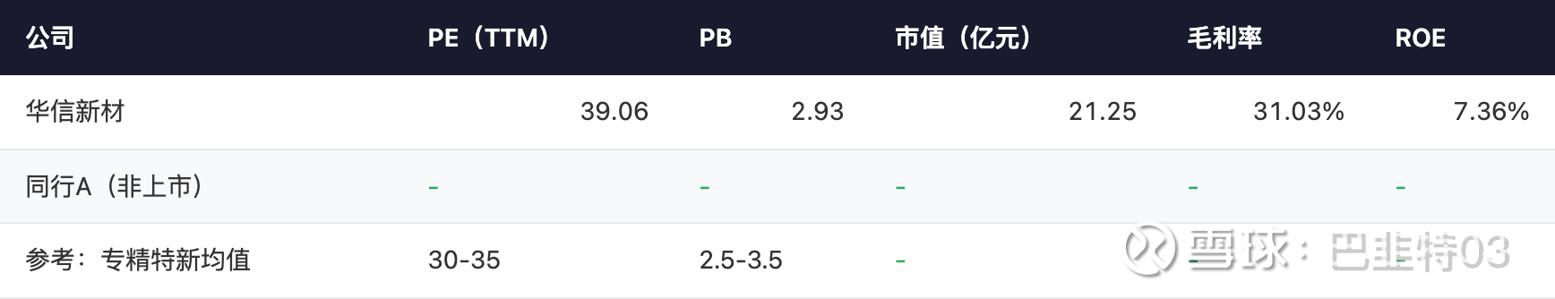 公司: 华信新材 | PE(TTM): 39.06 | PB: 2.93 | 市值(亿元): 21.25 | 毛利率: 31.03% | ROE: 7.36%