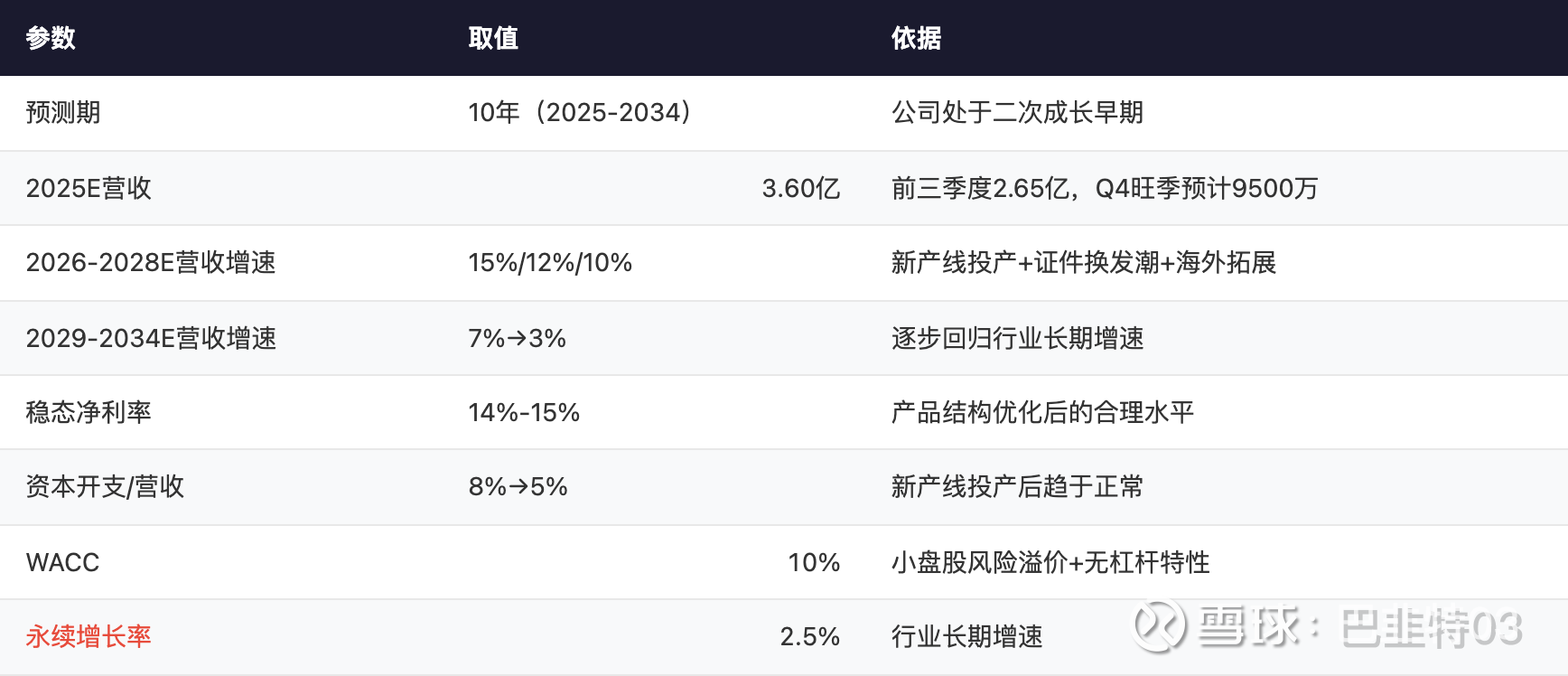参数: 预测期 | 取值: 10年(2025-2034) | 依据: 公司处于二次成长早期