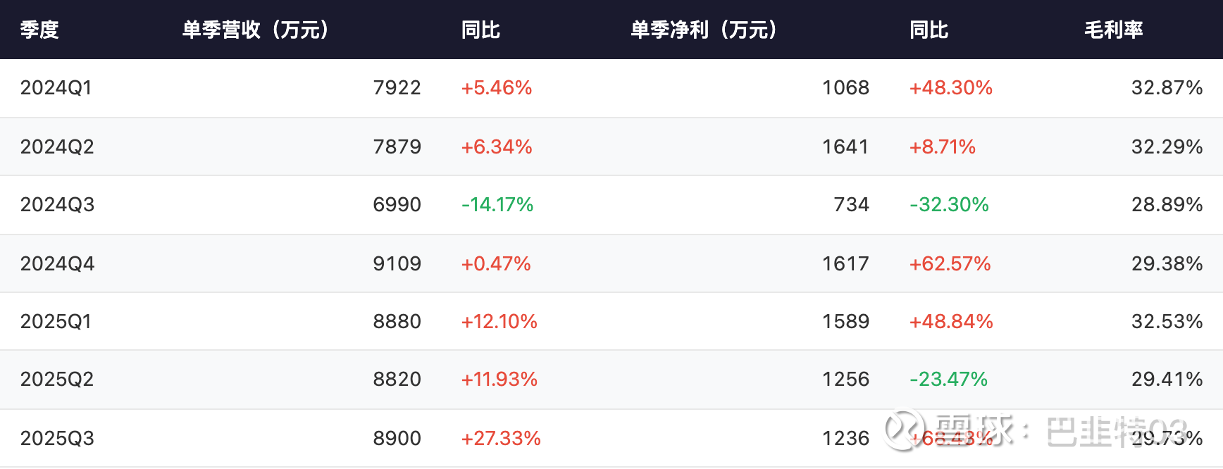 季度: 2025Q3 | 单季营收(万元): 8900 | 同比: +27.33% | 单季净利(万元): 1236 | 同比: +68.48% | 毛利率: 29.73%