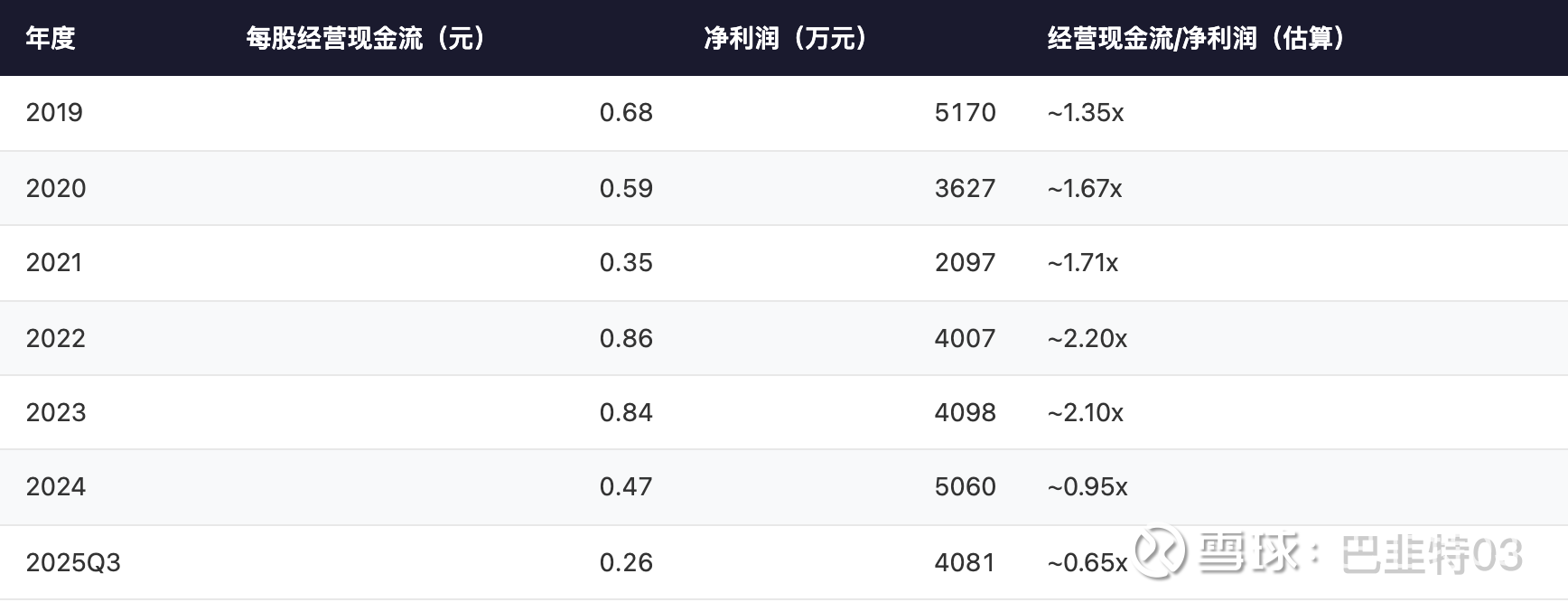 年度: 2025Q3 | 每股经营现金流(元): 0.26 | 净利润(万元): 4081 | 经营现金流/净利润(估算): ~0.65x