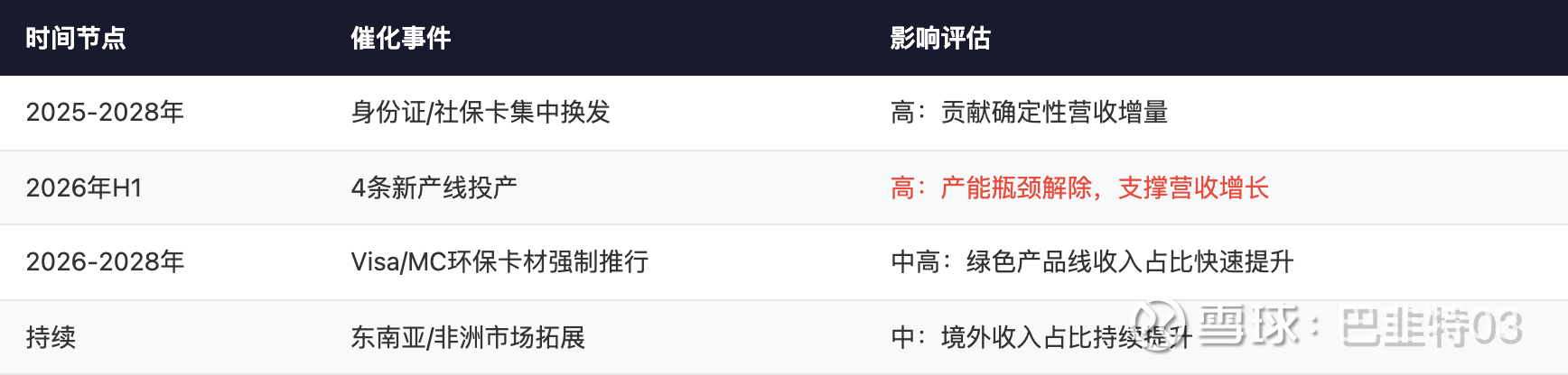 时间节点: 2026-2028年 | 催化事件: Visa/MC环保卡材强制推行 | 影响评估: 中高:绿色产品线收入占比快速提升