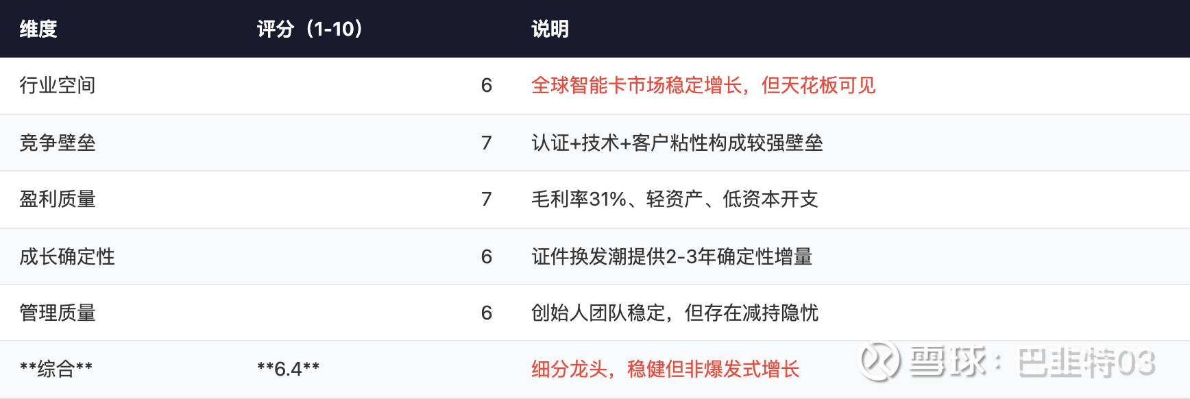 维度: 行业空间 | 评分(1-10): 6 | 说明: 全球智能卡市场稳定增长,但天花板可见
