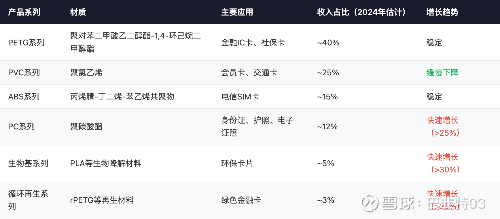 产品系列: PC系列 | 材质: 聚碳酸酯 | 主要应用: 身份证、护照、电子证照 | 收入占比(2024年估计): ~12% | 增长趋势: 快速增长(>25%)