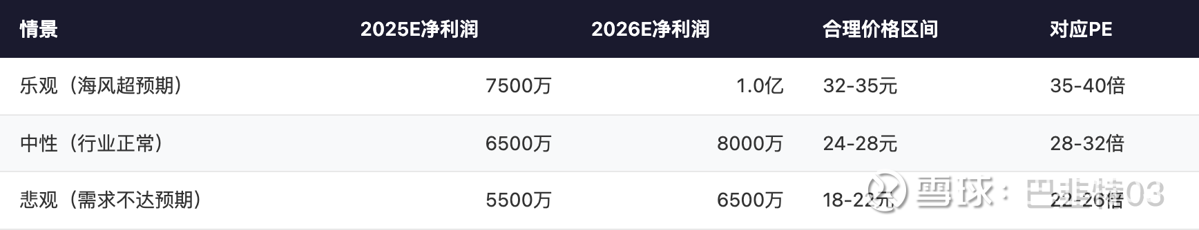 情景: 中性(行业正常) | 2025E净利润: 6500万 | 2026E净利润: 8000万 | 合理价格区间: 24-28元 | 对应PE: 28-32倍