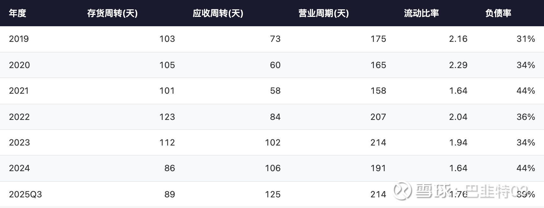 年度: 2025Q3 | 存货周转(天): 89 | 应收周转(天): 125 | 营业周期(天): 214 | 流动比率: 1.76 | 负债率: 39%