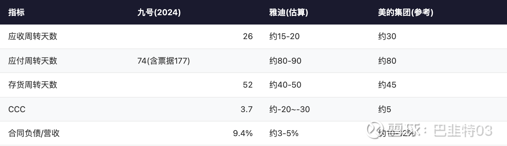 指标: CCC | 九号(2024): 3.7 | 雅迪(估算): 约-20~-30 | 美的集团(参考): 约5
