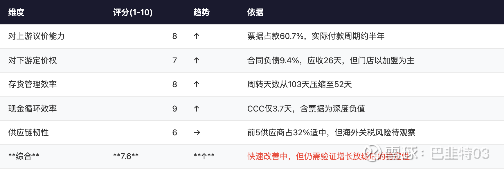 维度: 现金循环效率 | 评分(1-10): 9 | 趋势: ↑ | 依据: CCC仅3.7天,含票据为深度负值