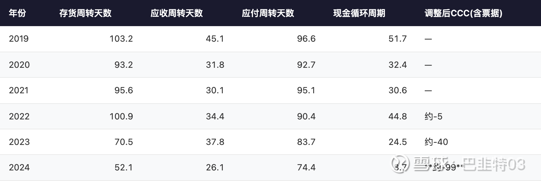 年份: 2024 | 存货周转天数: 52.1 | 应收周转天数: 26.1 | 应付周转天数: 74.4 | 现金循环周期: 3.7 | 调整后CCC(含票据): 约-99