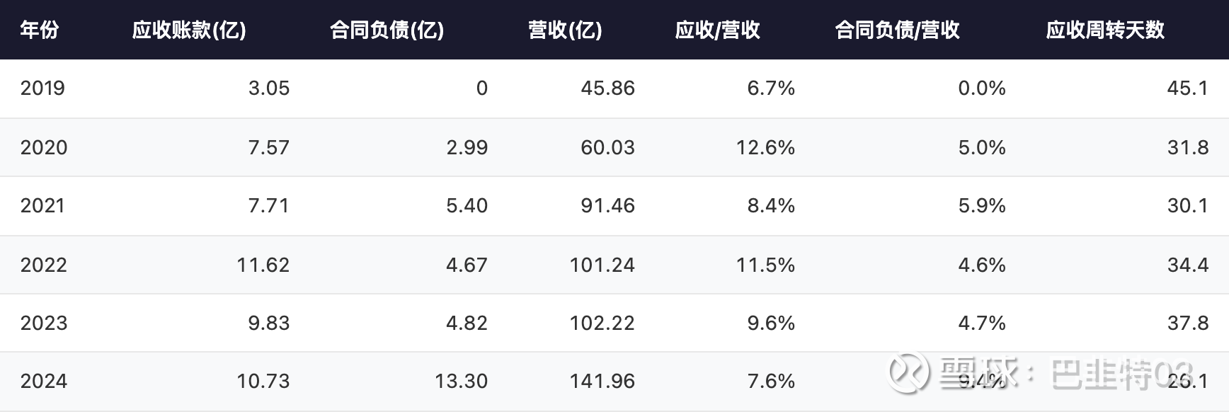 年份: 2024 | 应收账款(亿): 10.73 | 合同负债(亿): 13.30 | 营收(亿): 141.96 | 应收/营收: 7.6% | 合同负债/营收: 9.4% | 应收周转天数: 26.1