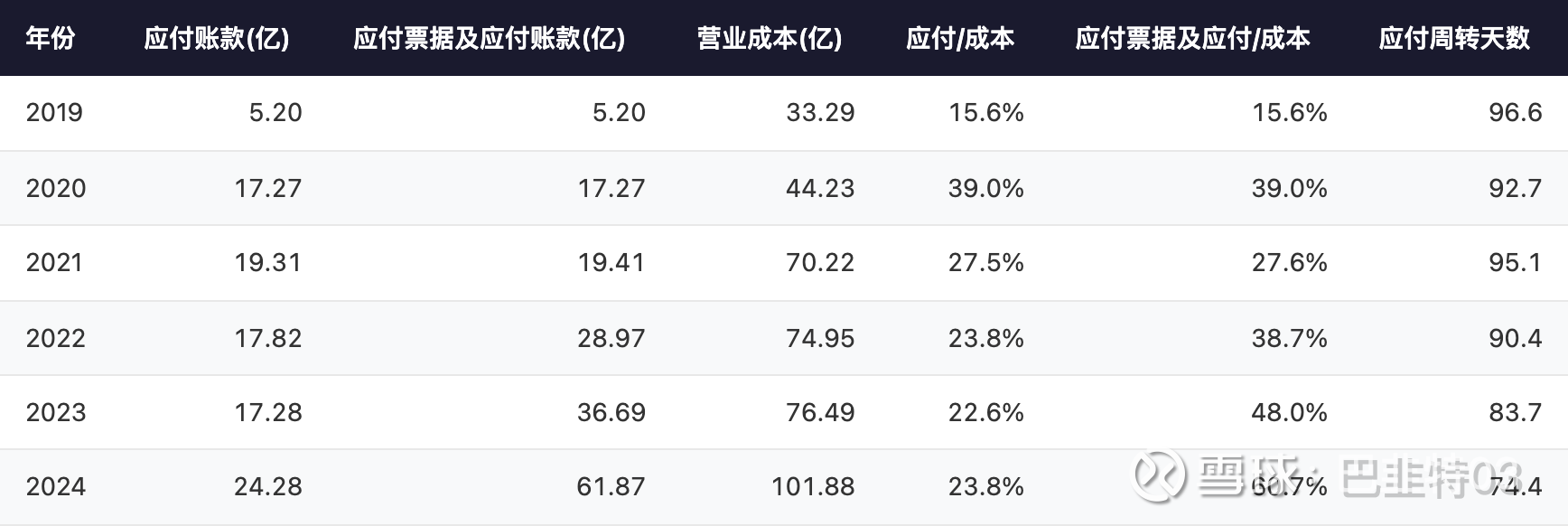 年份: 2024 | 应付账款(亿): 24.28 | 应付票据及应付账款(亿): 61.87 | 营业成本(亿): 101.88 | 应付/成本: 23.8% | 应付票据及应付/成本: 60.7% | 应付周转天数: 74.4