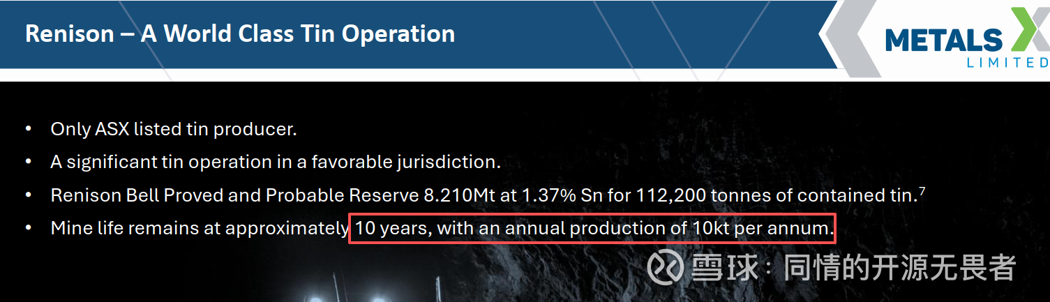 从资源总量而言似乎应该还有41万吨的锡,但MLX这边9月披露的材料显示相关资源还有11.22万吨(不含尾矿),还能开采10年,每年产量差不多在10000吨。这个地方我目前也还有点困惑,还打算再研究一下。@世说新语
