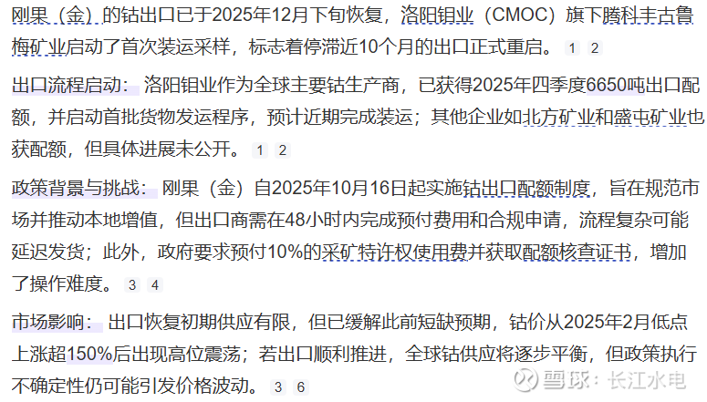 上面是百度查到的,还有其他途径查到的,我就不一一全都列出来了,信息都比较零散,我判断是已经开始外运了,这样从3月中下旬开始,洛钼就逐步开始有钴的收入确认了。趁现在固态、半固态电池还没量产,这2、3年还有几年好钱赚,钴能多卖尽量多卖点儿,当然了现在想多卖也卖不了,只能按照配额了