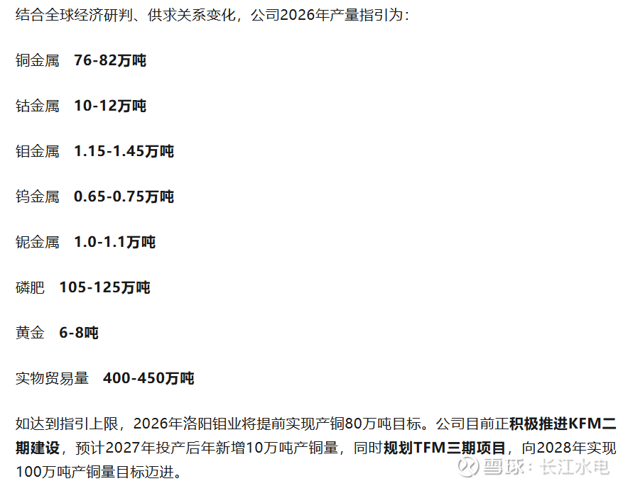 2026年指引已经出来了,铜预计80万吨,以现在这个铜价,暂时不考虑刚果金的暴利税,我里个去…… 明年又是大赚特赚的一年。再说说钴,产这么多氢氧化钴,全卖出去那时不可能了,只能按配额卖,以现在钴的价格,明年全年的利润增量还是相当可以期待一下的。其他的,包括黄金我都不说了,大家自己看吧。我再强调一下,以上有个前提哈,就是以现在这个价格!!!TFM三期公司终于吐口了,之前这嘴严实的,如果三期今年下半年开干,2028年100万吨,我觉得还是保守了。现在TFM西区是5条产线,如果东区或者北区,再开5条产线,2028年至2029年我乐观猜想下,你说他整出120万吨我都信