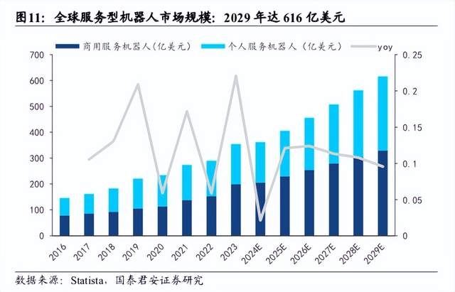 根据Statista数据显示,全球服务型机器人2024年市场规模预计362亿美元,2029年预计达到616亿美元,五年CAGR达11.2%。机器人技术的不断升级、价格不断下降以及下游客户付费意愿逐渐增强,加速服务机器人市场快速增长。
