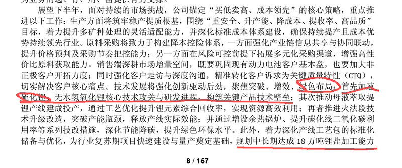 半年报提到在加速功课硫化锂技术,另外野心很足,中长期规划18万吨锂盐加工能力,也没说加工成什么。另外,钼精矿的价格持续上升,已经突破上半年最高点的3855元每吨,价格达到4604元每吨,涨幅离均价为30%,上半年营收18亿,出货量应该为5万吨左右,按30%涨幅算,营收为24亿,利润未知,如果成本为2000,则下半年利润,1.3亿。碳酸锂方面,价格一季度为7.4,二季度最低6,三季度高于7.5,四季度有望维持或者上升,营收上半年为6.2亿,出货量应该为1万吨左右。成本7.5,碳酸锂假设下半年价格为7.7,出货量一万吨,利润2千万。下半年总利润1.5亿,勉强是全年盈利。扣除管理费用还不一定。可能机会在于一个是硫化锂技术突破,产品附加值提升,且出货量提升,总产量为4.5万吨。第二,永荣的定增下半年过股东会,有一定注入资产预期溢价。第三,市场太高了固态电池和碳酸锂,硫化锂的溢价。