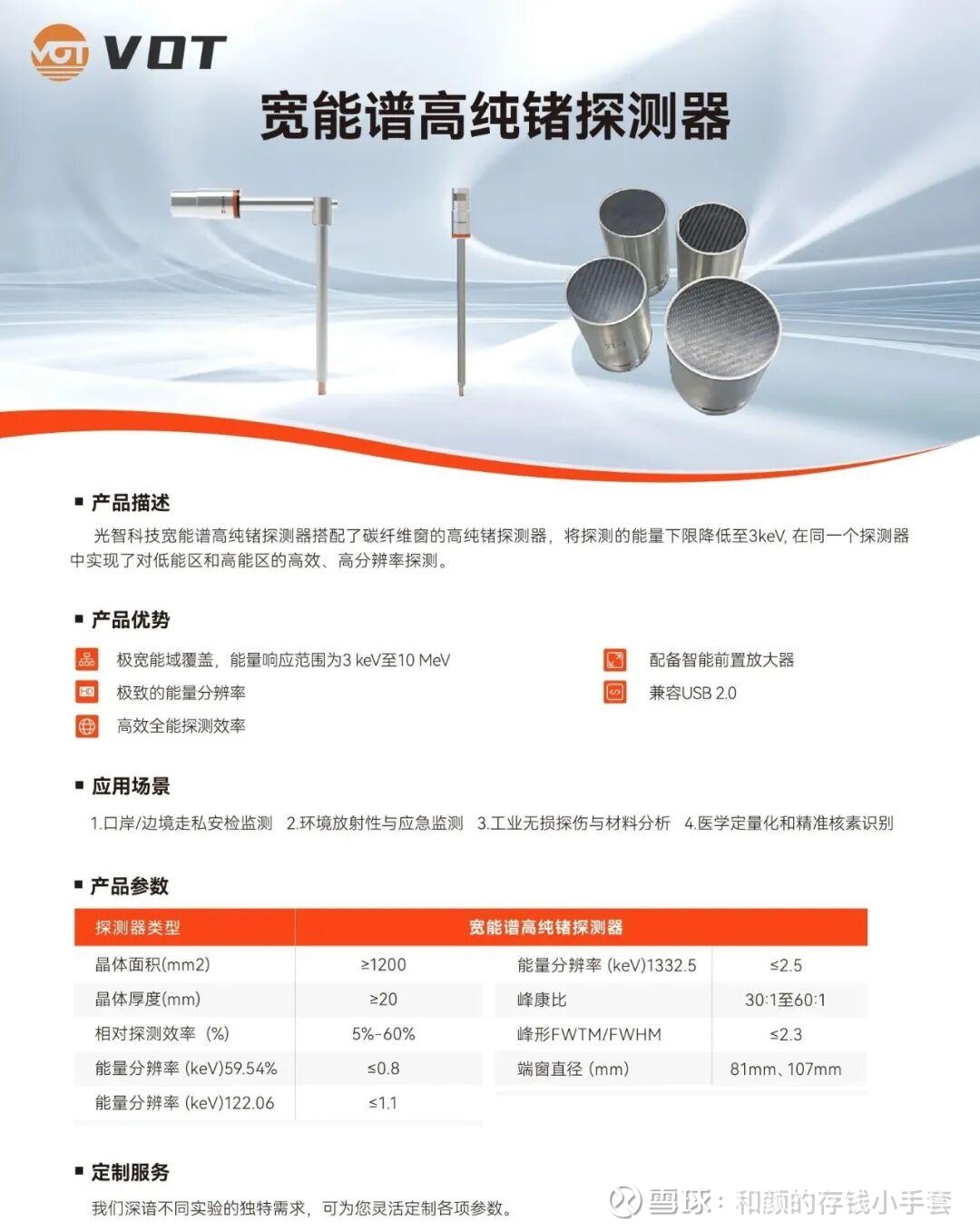 高纯锗探测器:基于13N高纯锗晶体,具备优异性噪比与能量分辨率,适用于γ射线与X射线能谱分析,在核电站辐射监测、物理实验及核安全保障等领域性能表现卓越。