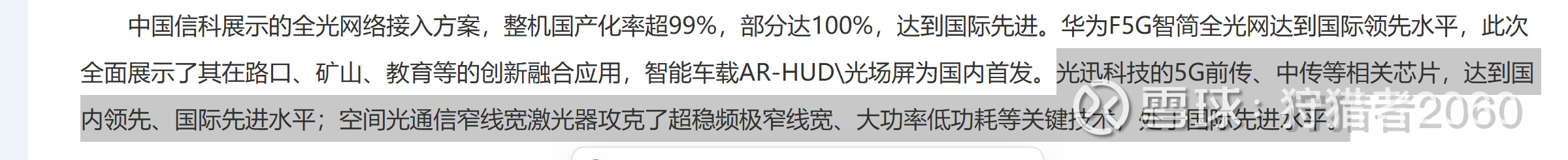 光迅科技的5G前传、中传等相关芯片,达到国内领先、国际先进水平;空间光通信窄线宽激光器攻克了超稳频极窄线宽、大功率低功耗等关键技术,处于国际先进水平。