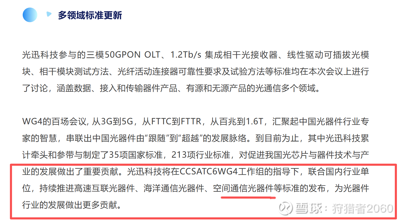 光迅科技累计牵头和参带与制定了35项国家标准,213项行业标准,对促进我国光芯片与器件技术与产业的发展做出了重要贡献。光迅科技将在CCSATC6WG4工作组的指导下,联合国内行业单位,持续推进高速互联光器件、海洋通信光器件、空间通信光器件等标准的发布,为光器件行业的发展做出更多贡献。