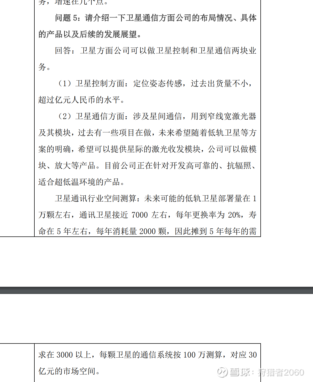 问题5:请介绍一下卫星通信方面公司的布局情况、具体的产品以及后续的发展展望。 回答:卫星方面公司可以做卫星控制和卫星通信两块业 务。 (1)卫星控制方面:定位姿态传感,过去出货量不小,超过亿元人民币的水平。 (2)卫星通信方面:涉及星间通信,用到窄线宽激光器及其模块,过去有一些项目在做,未来希望随着低轨卫星等方案的明确,希望可以提供星际的激光收发模块,公司可以做模块、放大等产品。目前公司正在针对开发高可靠的、抗辐照、适合超低温环境的产品。