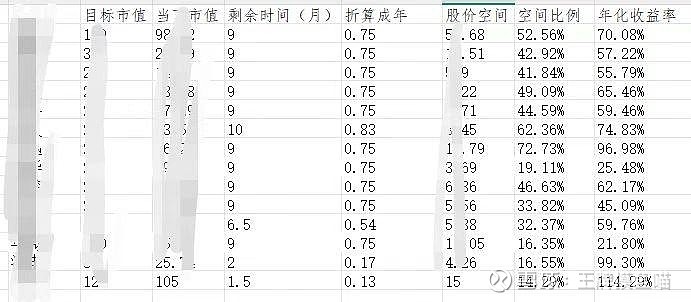 $ST浩丰(SZ300419)$ 忽然发现浩丰的贴子一下子多起来了,五块多的时候几天也没一条啊。虽然一个月涨了三成,但如果十一月摘帽时能升到30亿市值,按照时间成本折算的年化收益率依然高达100%。很多人对摘帽时间还早的票格外看不起,却不知道股价中所隐含的时间成本折价是非常充分甚至远远折过头的。为了把年化收益率数字化以便一目 了然,本喵有一个时时更新的表格,对假ST的年化预期收益率进行动态监控。当个股上涨过大,导致年化收益率不再符合要求,同时30分钟级别出现缠纶卖点时,就会卖出,摊向年化收益率更高的品种,如此滚动。。。。。