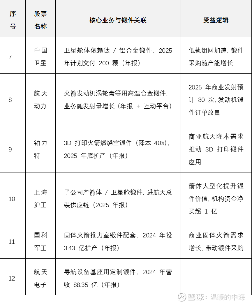 所有标的 “核心业务与锻件关联” 均基于年报、半年报或互动平台披露信息,按 “锻件核心 + 产业链协同” 分类,内容精简如下: