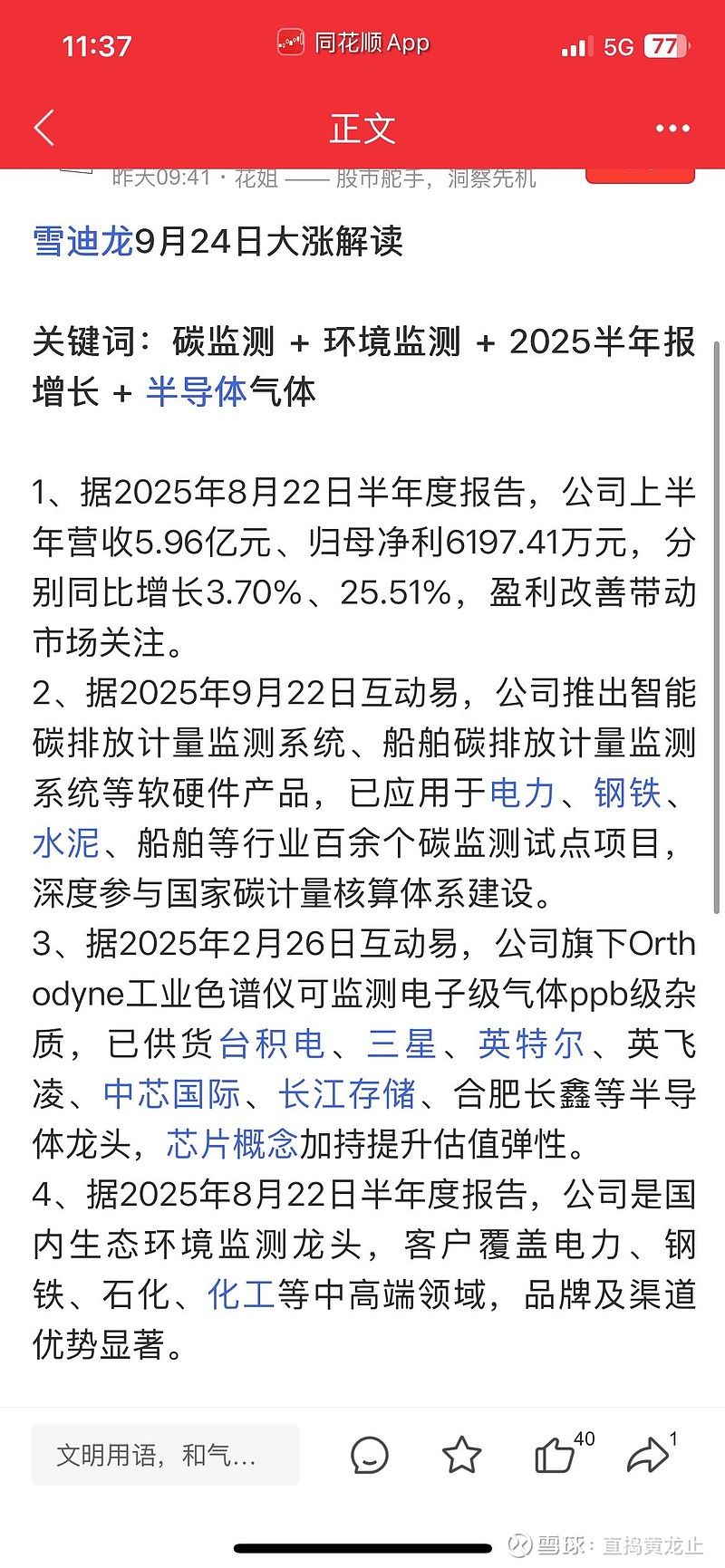 2025年上半年,雪迪龙实现归母净利润1.01亿元(同比+257%),毛利率回升至39.4%,经营现金流改善显著。当前估值(2025年PE 24倍)显著低于半导体设备板块平均PE(45倍)及环保设备龙头均值(35倍)。参考凯美特气因电子特气业务获市场重估的逻辑,雪迪龙兼具半导体材料+核电+碳监测三重概念,若给予35倍PE,目标市值有望突破120亿元,较当前存在80%上行空间。