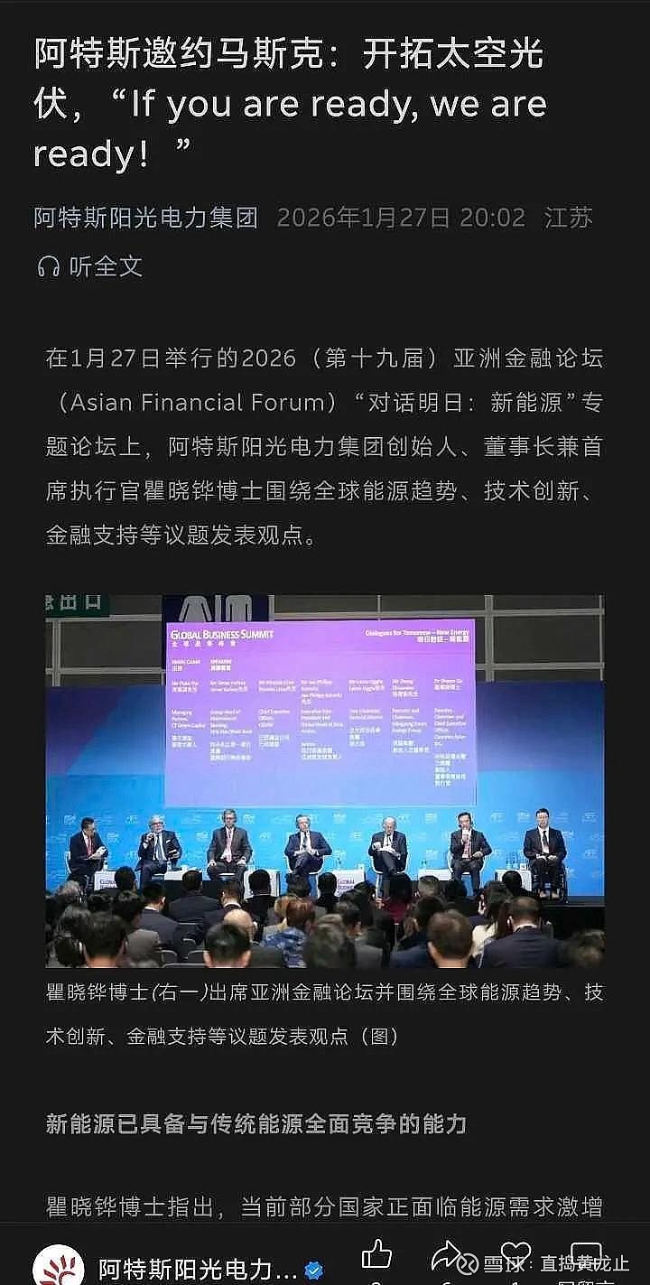 “如果马斯克选择太空光伏合作伙伴,阿特斯已经准备好了。”在今年1月的亚洲金融论坛上,阿特斯董事长瞿晓铧博士公开向马斯克发出合作邀约。这一表态背后,是阿特斯两年来对太空光伏技术的秘密布局。